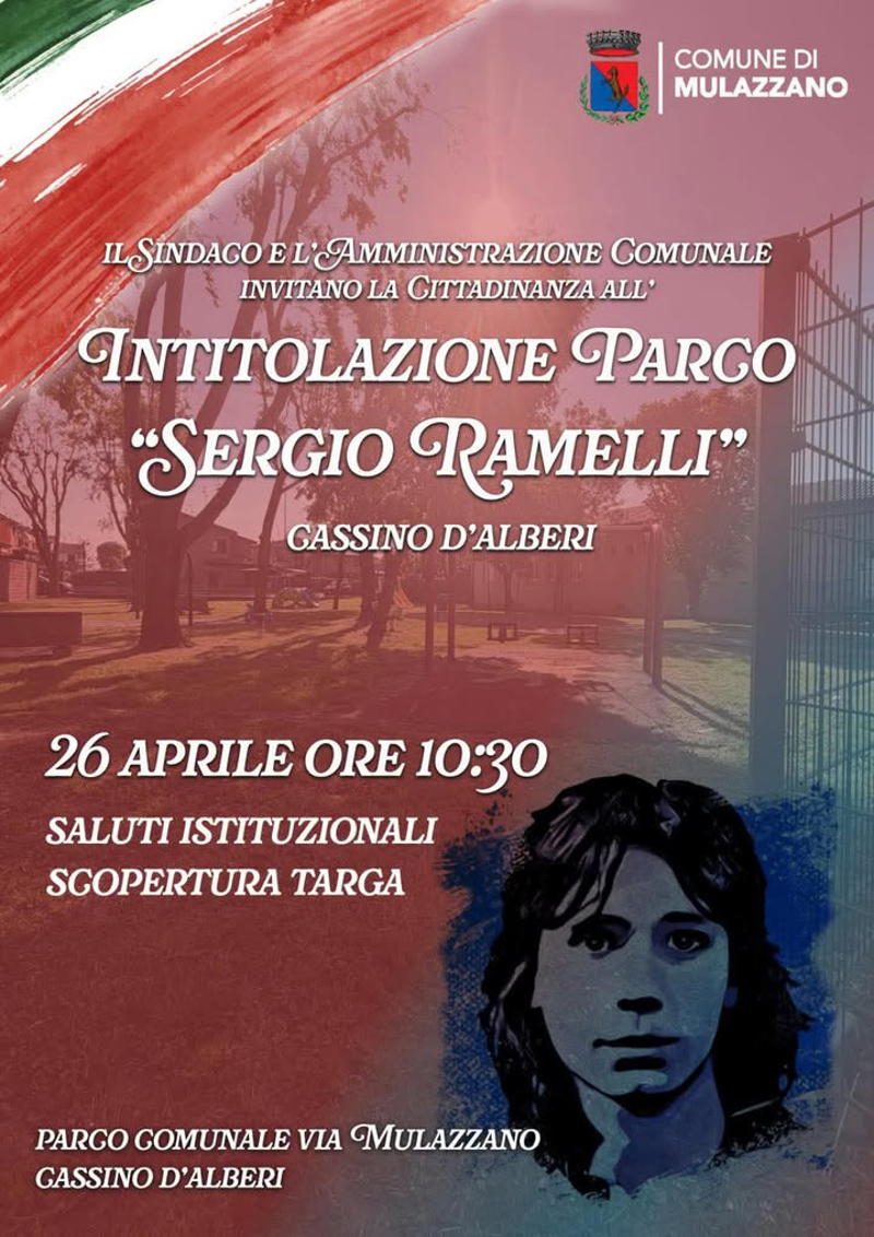 Cerimonia di intitolazione del parco a Sergio Ramelli con saluti istituzionali e scopertura della targa.
