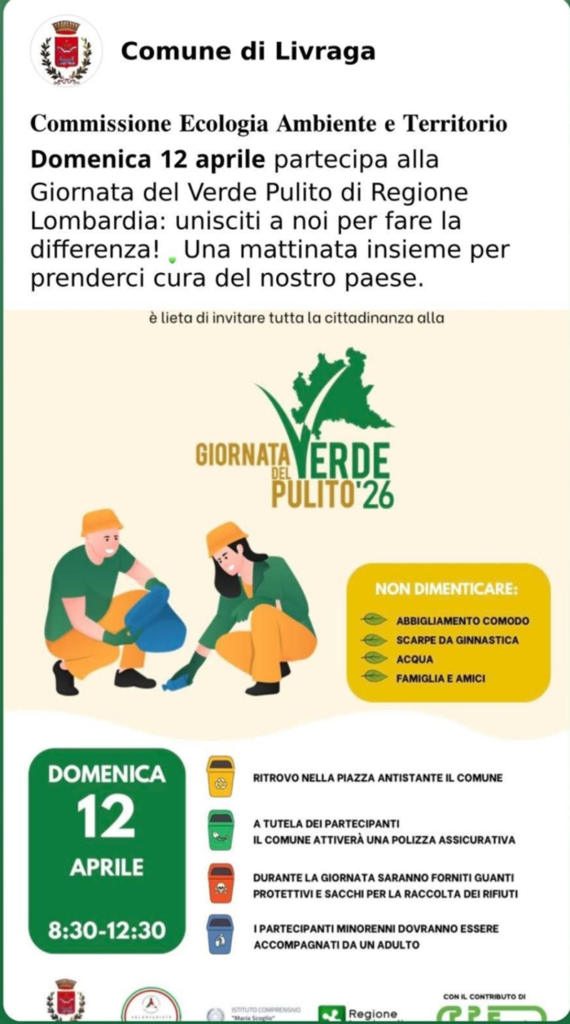 Mattinata di volontariato per la pulizia del paese. Ritrovo nella piazza davanti al Municipio; il Comune attiverà una polizza assicurativa. Saranno forniti guanti protettivi e sacchi; i minorenni devono essere accompagnati. Consigliato abbigliamento comodo, scarpe da ginnastica e acqua; porta famiglia e amici.