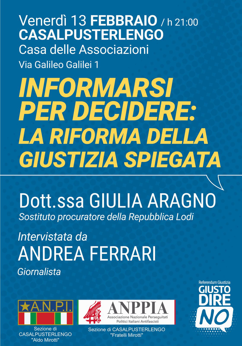 Serata informativa sulla riforma della giustizia: intervento di una sostituta procuratrice della Repubblica di Lodi, intervistata da un giornalista.