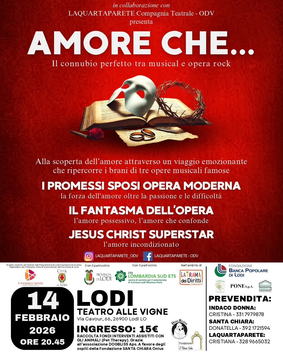 Spettacolo che unisce musical e opera rock in un viaggio sull’amore attraverso tre opere: I Promessi Sposi opera moderna (la forza dell’amore oltre la passione e le difficoltà), Il Fantasma dell’Opera (l’amore possessivo che confonde), Jesus Christ Superstar (l’amore incondizionato). Serata di raccolta fondi per gli interventi assistiti con gli animali (Pet Therapy) con DogBliss Aps, a favore della fondazione santa Chiara Onlus.