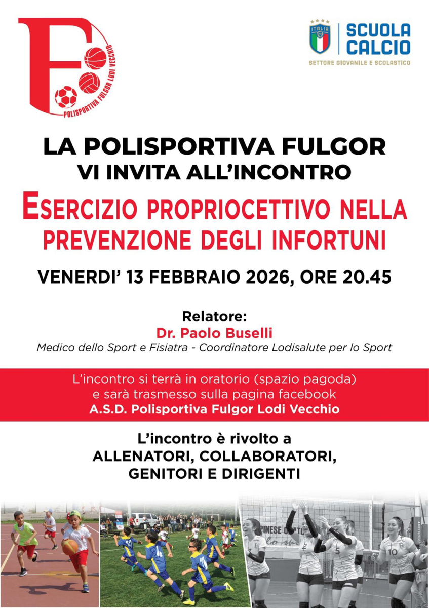 Incontro con il dr. Paolo Buselli (medico dello sport e fisiatra, coordinatore Lodisalute per lo Sport). Sarà trasmesso sulla pagina Facebook Asd Polisportiva Fulgor Lodi Vecchio. Rivolto a allenatori, collaboratori, genitori e dirigenti.