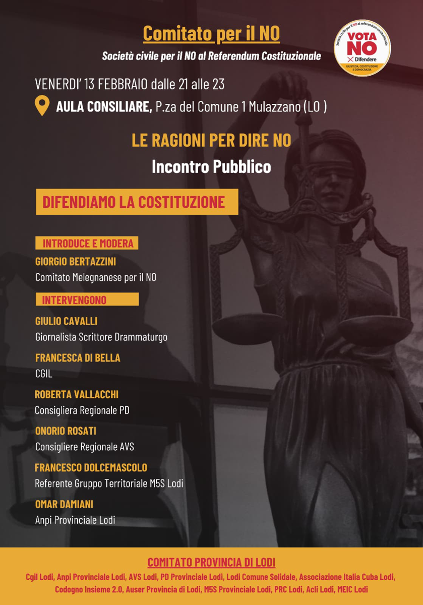 Incontro del Comitato per il no: difendiamo la Costituzione. Introduce e modera Giorgio Bertazzini. Interventi di Giulio Cavalli; Francesca Di Bella; Roberta Vallacchi; Onorio Rosati; Francesco Dolcemascolo; Omar Damiani.