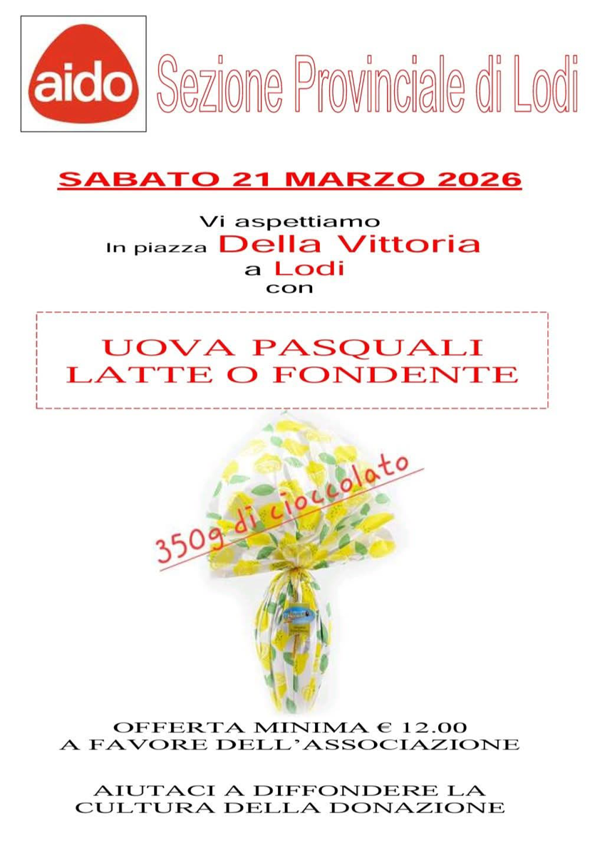 Banchetto della Sezione Provinciale AIDO di Lodi con uova pasquali da 350 g, al latte o fondente. Iniziativa a favore dell’associazione; invito a diffondere la cultura della donazione.