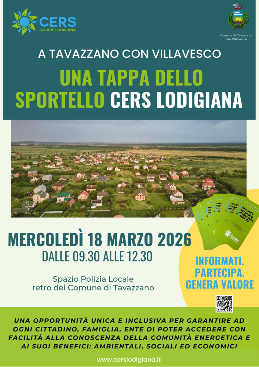 Sportello informativo sulla Comunità Energetica Cers Lodigiana: occasione per cittadini, famiglie ed enti di conoscere la comunità energetica e i suoi benefici ambientali, sociali ed economici.
