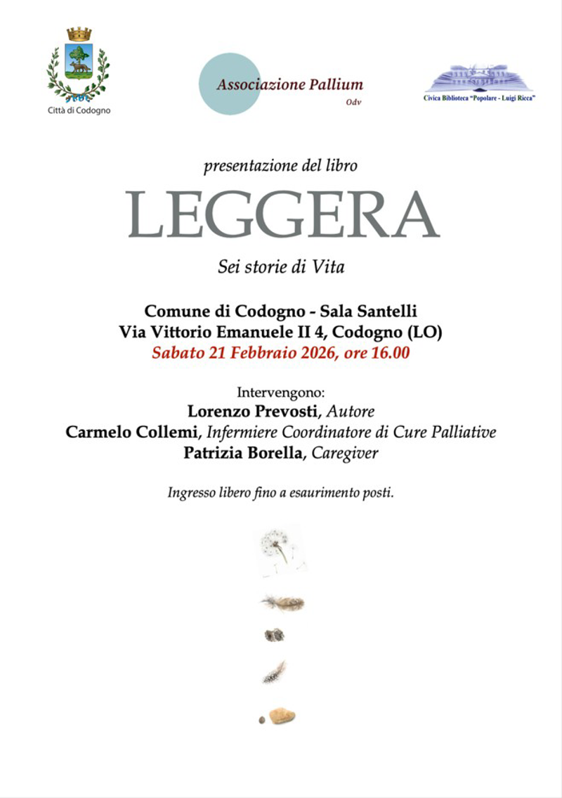 Presentazione del volume “Leggera. Sei storie di vita”. Intervengono Lorenzo Prevosti (autore), Carmelo Collemi (infermiere coordinatore di Cure Palliative) e Patrizia Borella (caregiver). Ingresso libero fino a esaurimento posti.