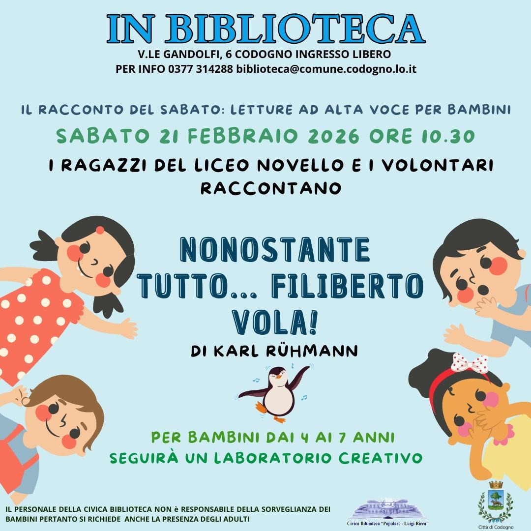 Il racconto del sabato: letture ad alta voce per bambini. I ragazzi del Liceo Novello e i volontari raccontano “Nonostante tutto... Filiberto vola!” di Karl Rühmann. Per bambini 4-7 anni; seguirà un laboratorio creativo. Ingresso libero; richiesta la presenza di un adulto.