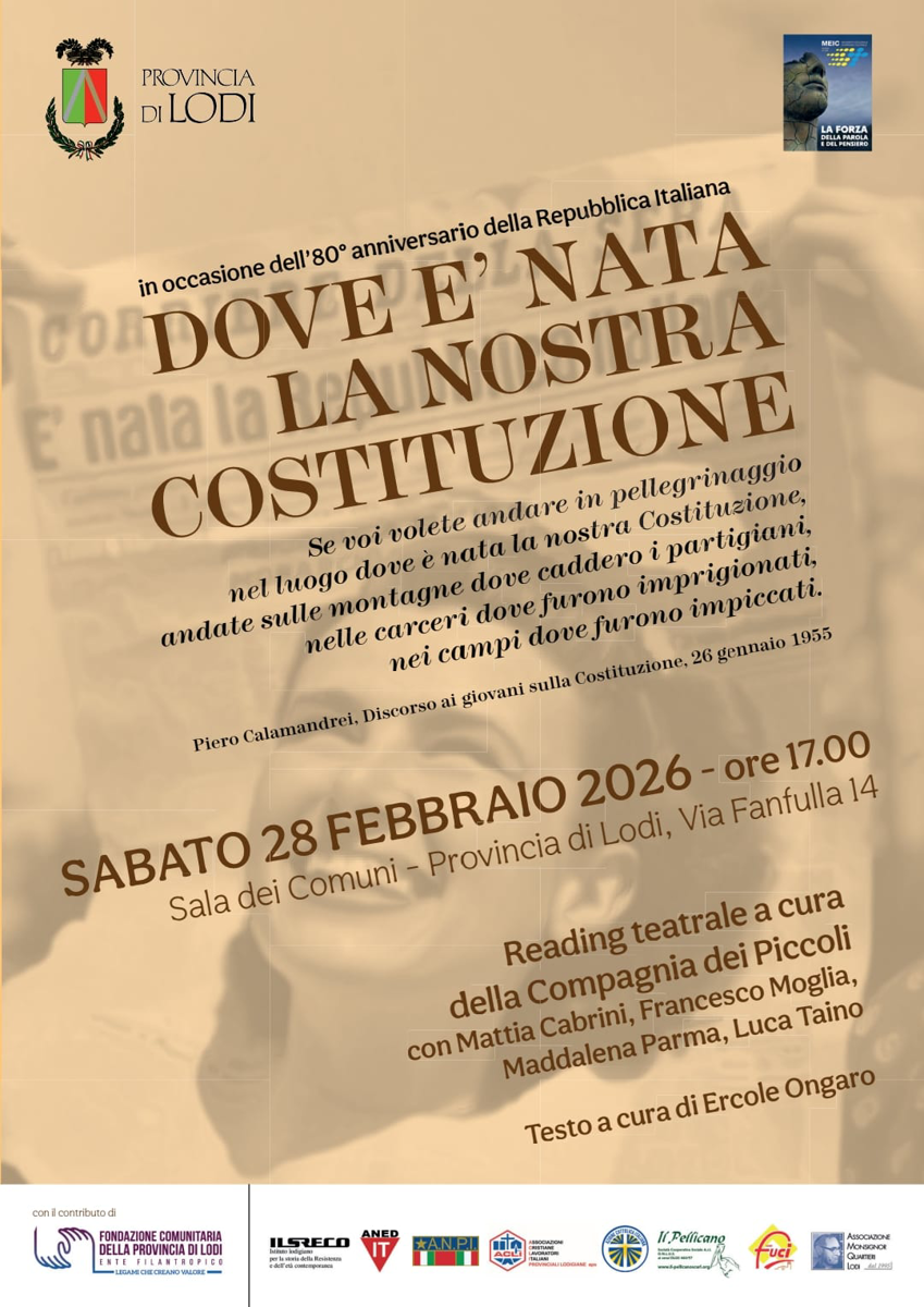 Reading teatrale a cura della Compagnia dei Piccoli con Mattia Cabrini, Francesco Moglia, Maddalena Parma e Luca Taino. Testo a cura di Ercole Ongaro. In occasione dell’80° anniversario della Repubblica Italiana.