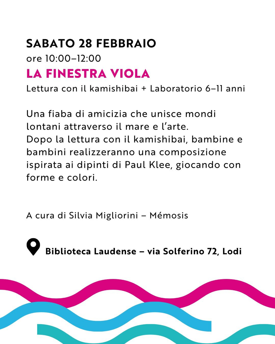 Lettura con il kamishibai e laboratorio per bambine e bambini 6–11 anni. Dopo la lettura, composizione ispirata ai dipinti di Paul Klee, con giochi di forme e colori. A cura di Silvia Migliorini – Mémosis.