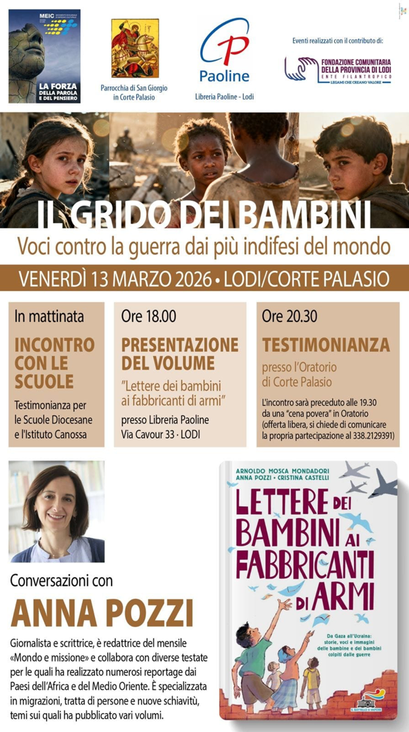 In mattinata incontro con le scuole (Scuole Diocesane e Istituto Canossa). Alle 18:00 presentazione del volume “Lettere dei bambini ai fabbricanti di armi” presso la Libreria Paoline (Lodi). Alle 20:30 testimonianza all’Oratorio di Corte Palasio, preceduta alle 19:30 da una “cena povera” in oratorio (offerta libera). Conversazioni con Anna Pozzi.