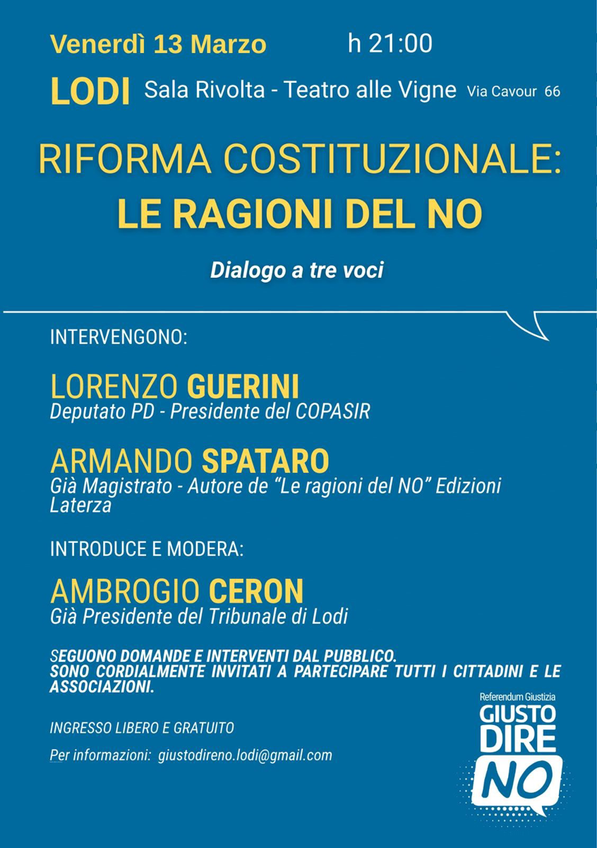 Dialogo a tre voci con Lorenzo Guerini (deputato PD, presidente del COPASIR) e Armando Spataro (già magistrato, autore di “Le ragioni del NO”, Edizioni Laterza). Introduce e modera Ambrogio Ceron (già presidente del Tribunale di Lodi). Seguono domande e interventi dal pubblico.