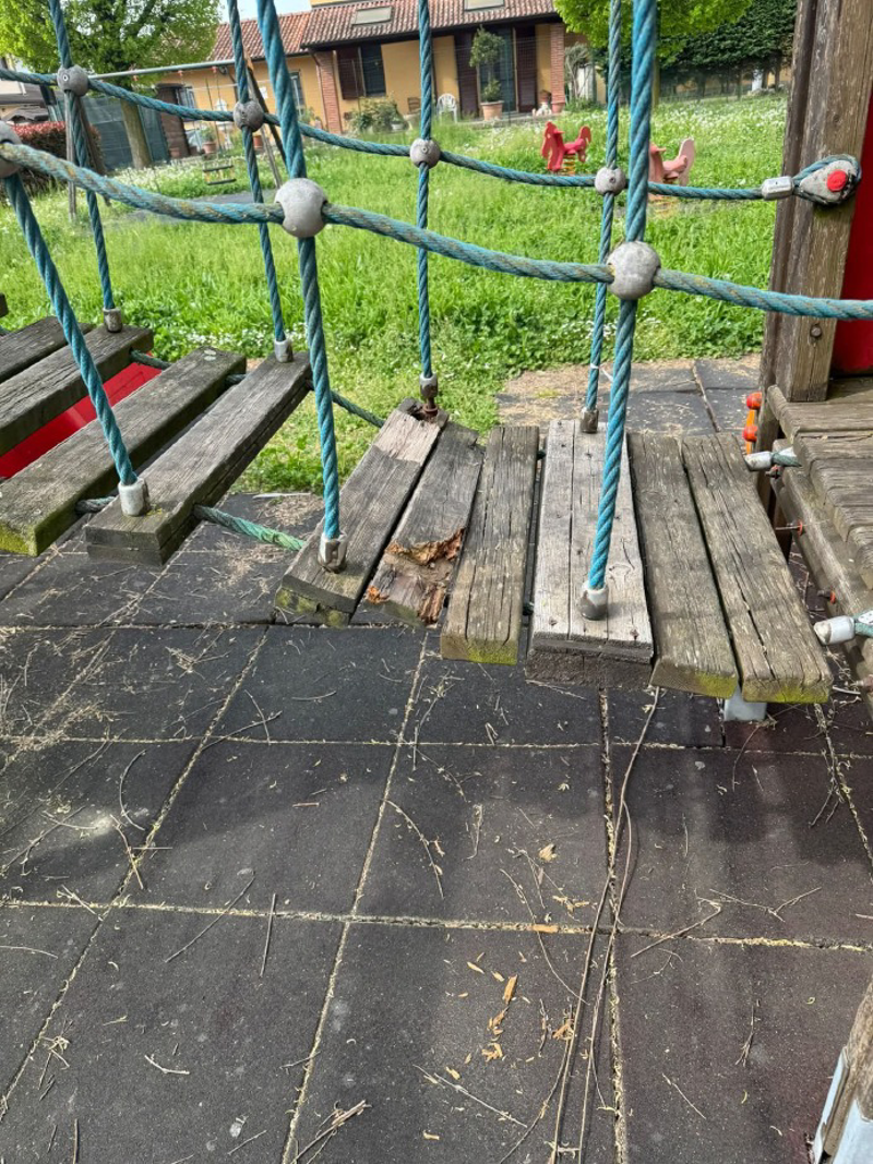 Le immagini mostrano alcune strutture danneggiate e segni evidenti di usura, con parti deteriorate e pavimentazione irregolare.