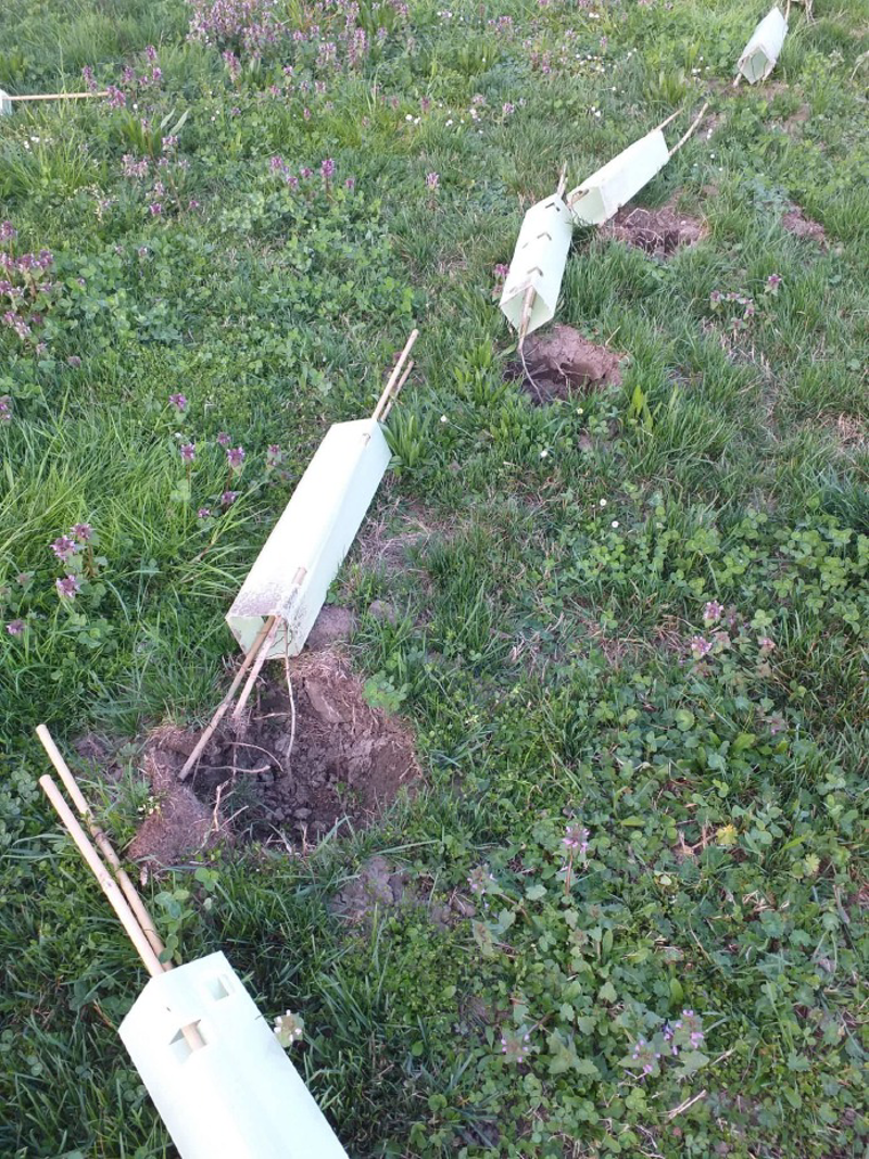 Si tratta di piante molto giovani, ancora protette dai tubi di difesa utilizzati nelle prime fasi di crescita per difenderle dagli animali selvatici – in particolare roditori, conigli e lepri, ghiotti dei germogli. Questa volta, però, i danni sembrano arrivare dall’uomo.
