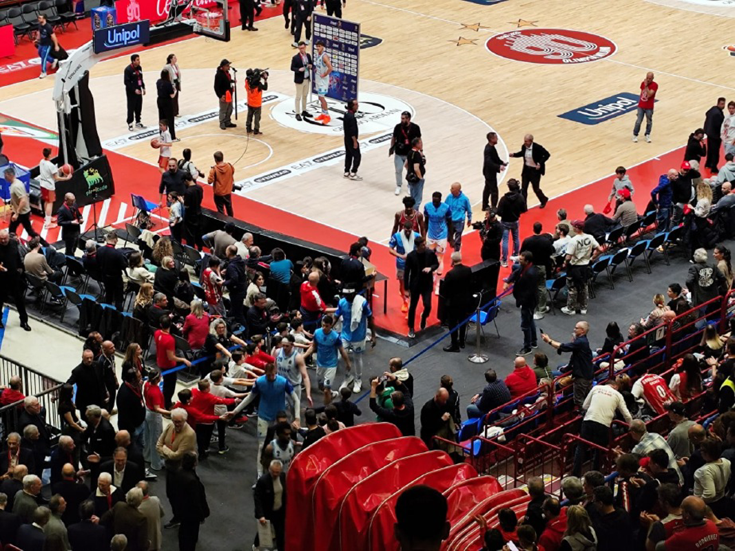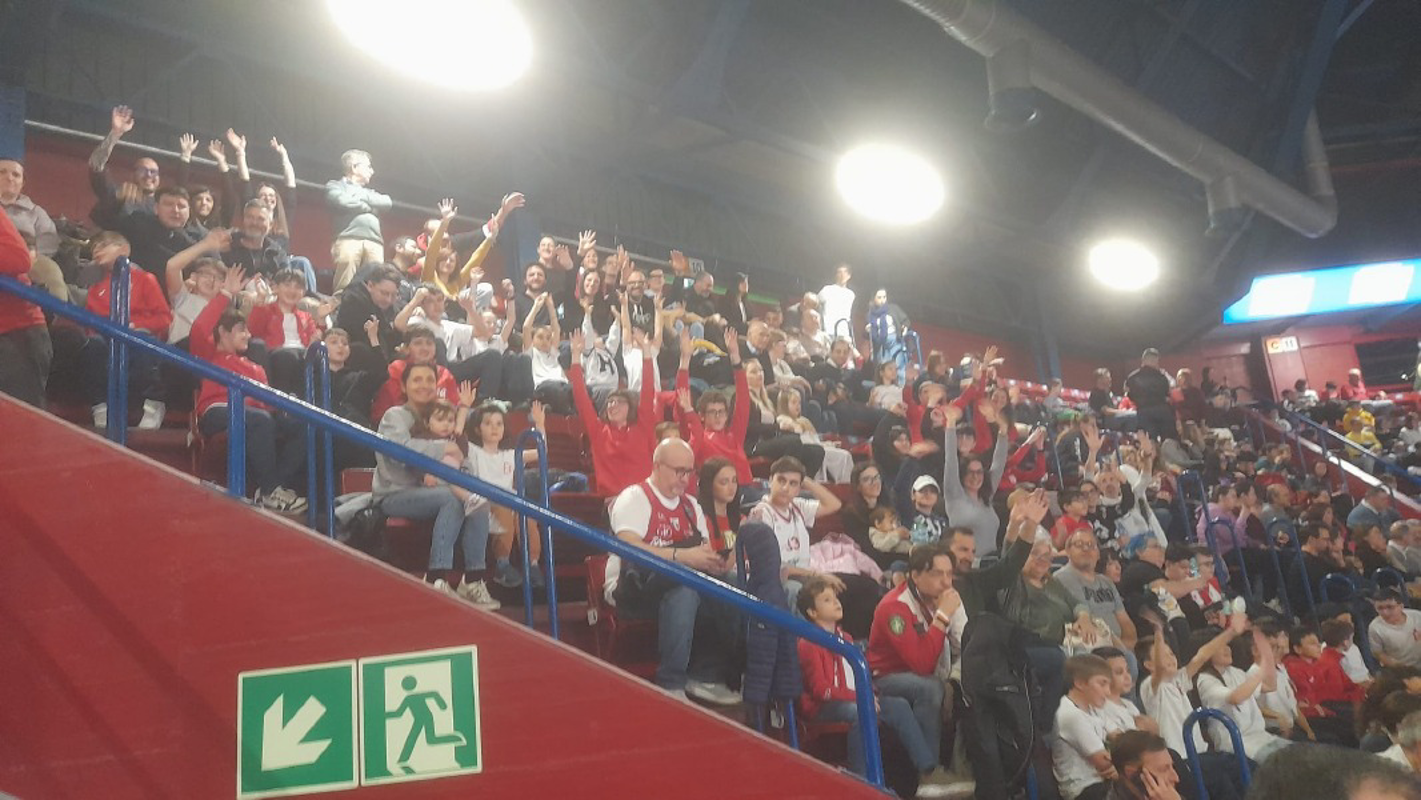 L'Olimpia ha battuto Sassari 99-87: i bambini della polisportiva hanno portato bene, come avevano fatto anche con l'Assigeco a Piacenza lo scorso autunno.