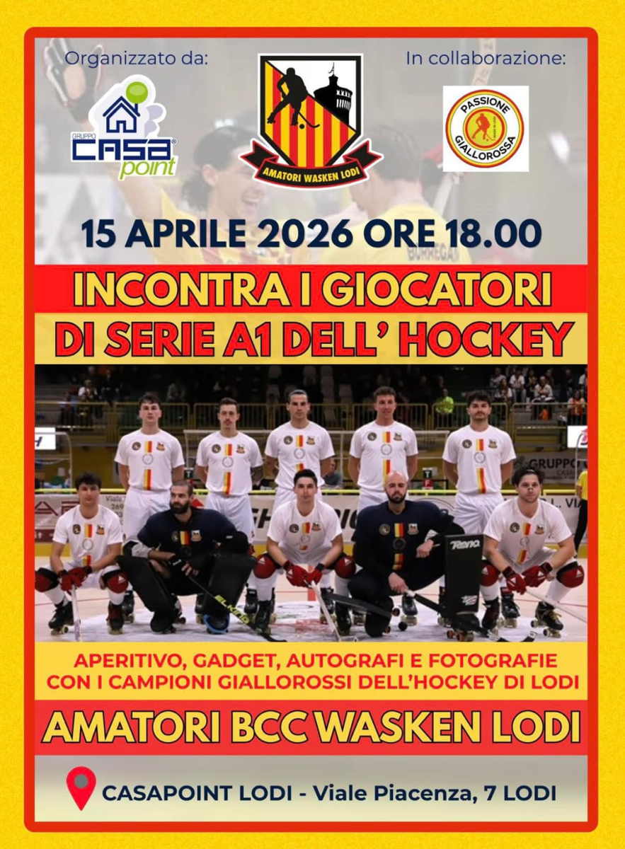 Aperitivo, gadget, autografi e fotografie con i campioni giallorossi dell’hockey di Lodi. Evento organizzato da Casapoint Lodi in collaborazione con Passione Giallorossa.
